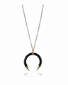 Collana a mezzaluna in ottone spazzolato, intarsiata con piccoli bottoni d’ottone lucidi e martellati disposti in modo armonico lungo la curva. Sottile e leggera, con bordi smussati e catenina tono su tono regolabile, combina un fascino vintage e un look raffinato, perfetta per l’uso quotidiano o per un tocco elegante serale.