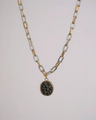 Una collana con maglie d’acciaio e una catena robusta ma raffinata, maglie piatte e lucide che seguono il collo con un carattere deciso. Al centro scende un pendente rotondo tempestato di cristalli neri, taglio sfaccettato che cattura la luce con riflessi profondi. L’insieme è audace e molto accattivante, perfetto per chi cerca un look contemporaneo e di forte personalità.