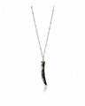 Collana a forma di corno, slanciata e leggermente ricurva, intarsiata con sottili tasselli di madreperla che donano riflessi iridescenti. Montatura lucida a contrasto con la morbidezza della madreperla; elegante e raffinata, ideale per un look naturale e sofisticato.